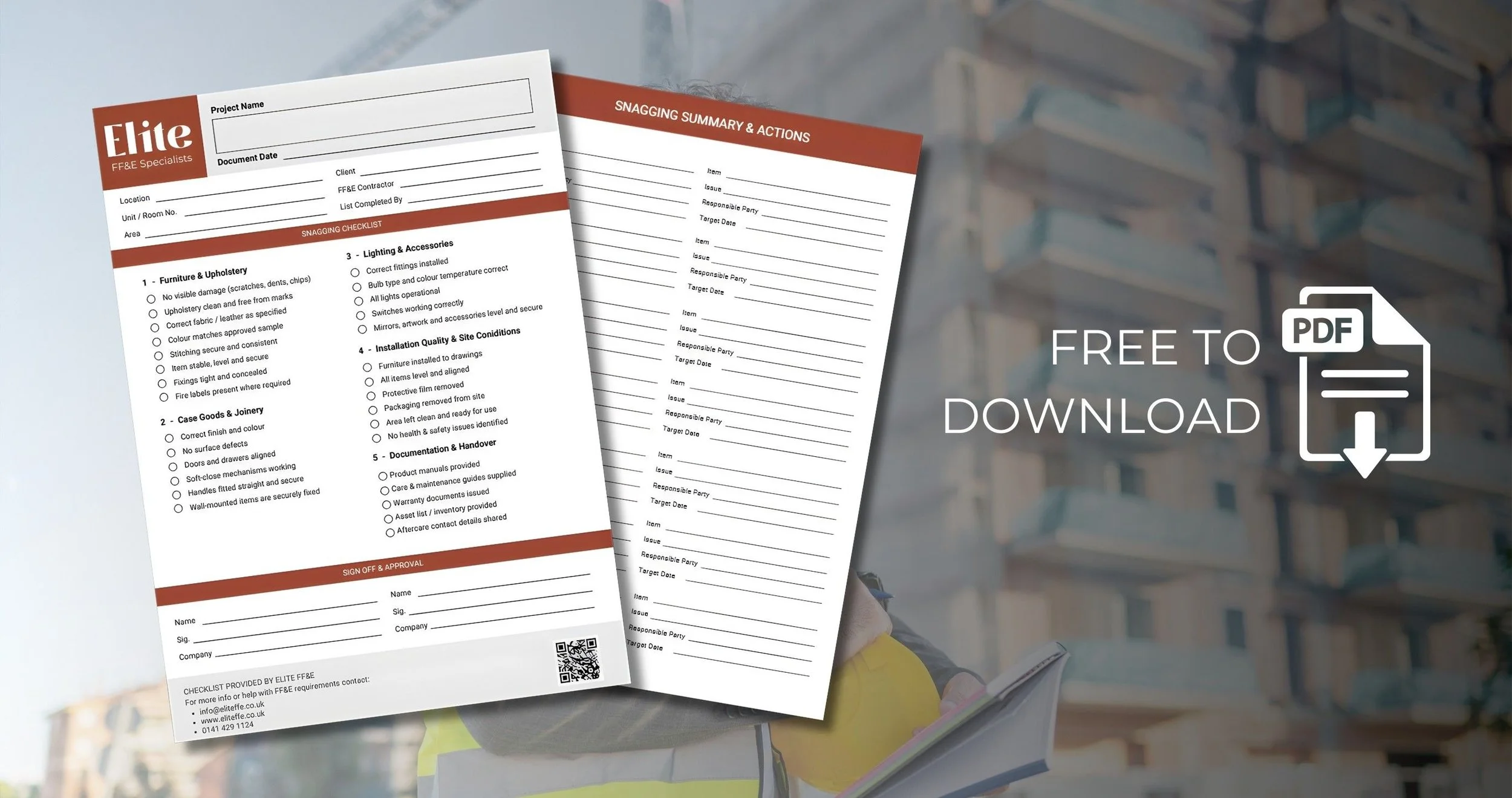 FF&E snagging is a structured quality check of all supplied furniture, fixtures and equipment before handover. It happens once items are delivered and installed to ensure: